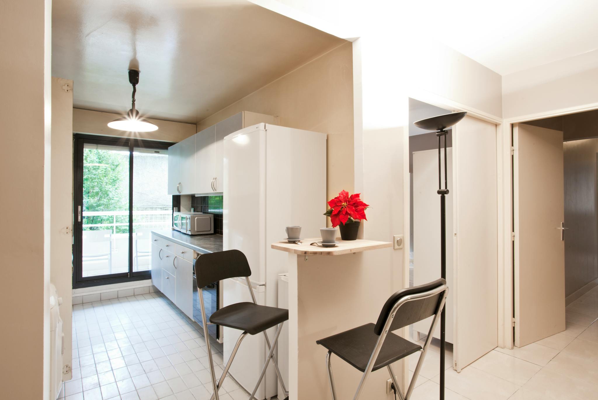 Cuisine américaine entre la loggia et le salon, donnant à la coloc un aspect aéré et spacieux.