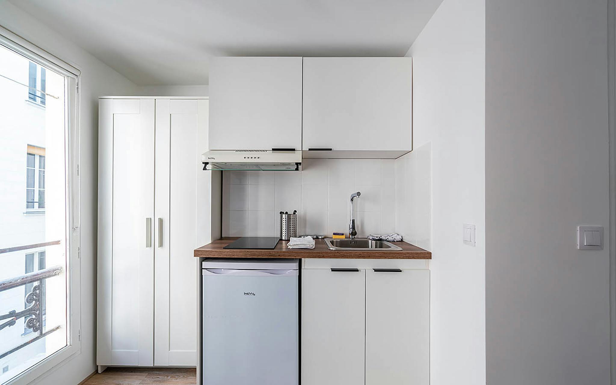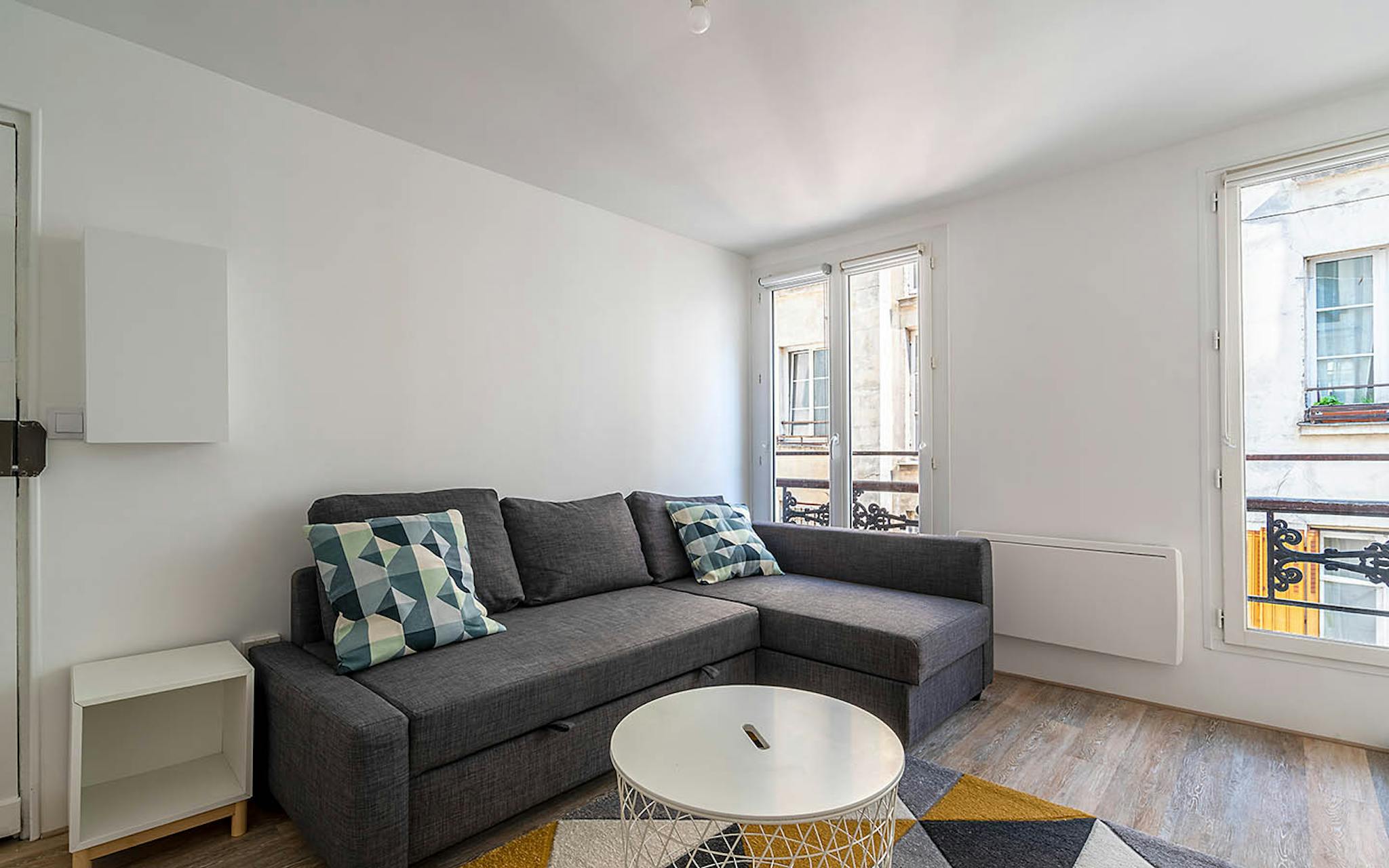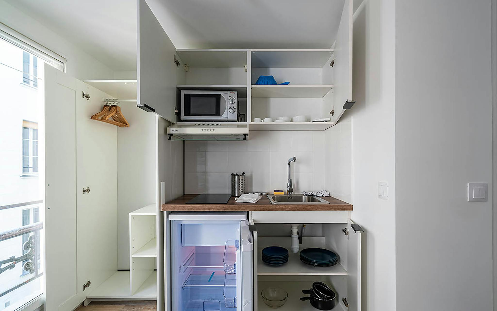 The room has a convertible bed, windows for ventilation, and a semi-equipped kitchen for self-cooking. The full bathroom provides a shower. Located close to metro stations like Strasbourg Saint-Denis (4 min), Metro Strasbourg-Saint-Denis (4 min), and Bonne Nouvelle (6 min). Nearby attractions like Choco-Story Paris – Musée du Chocolat, Grévin Museum, and FlyView Paris.