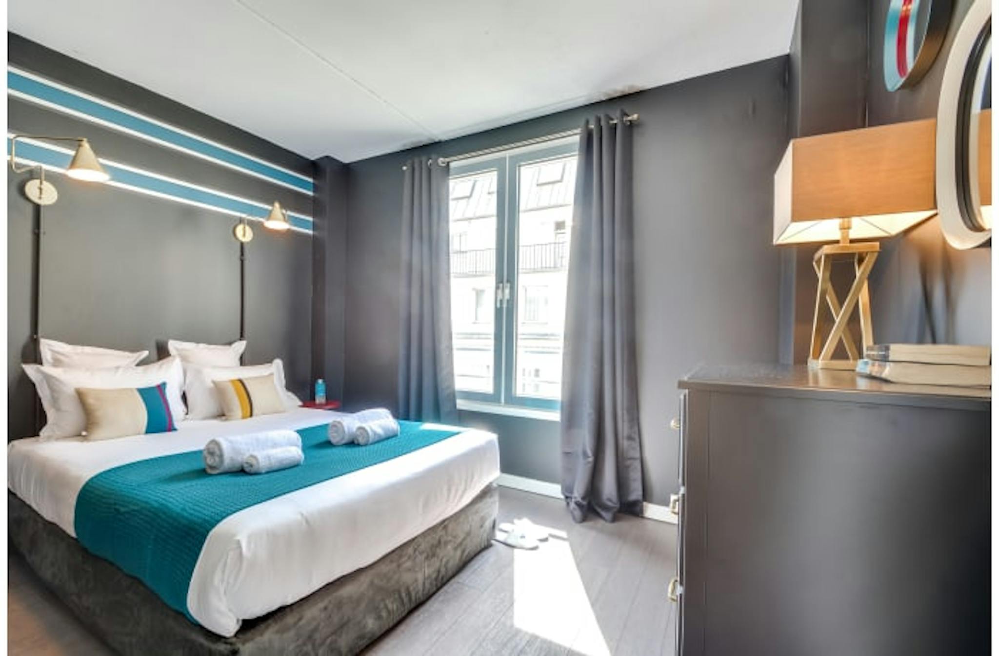 Inspired by the blue-and-gold glamour of Versailles, our local interior designer has designed a space that will make you feel like royalty. Flowing drapery, rich colors, and hanging mirrors give this apartment an exotic elegance, and huge windows fill the space with light. A fully equipped kitchen offers everything you need to prepare a French feast. Premium amenities include free WiFi, cable TV, hotel beds and linens, luxury toiletries, and a Nespresso machine.