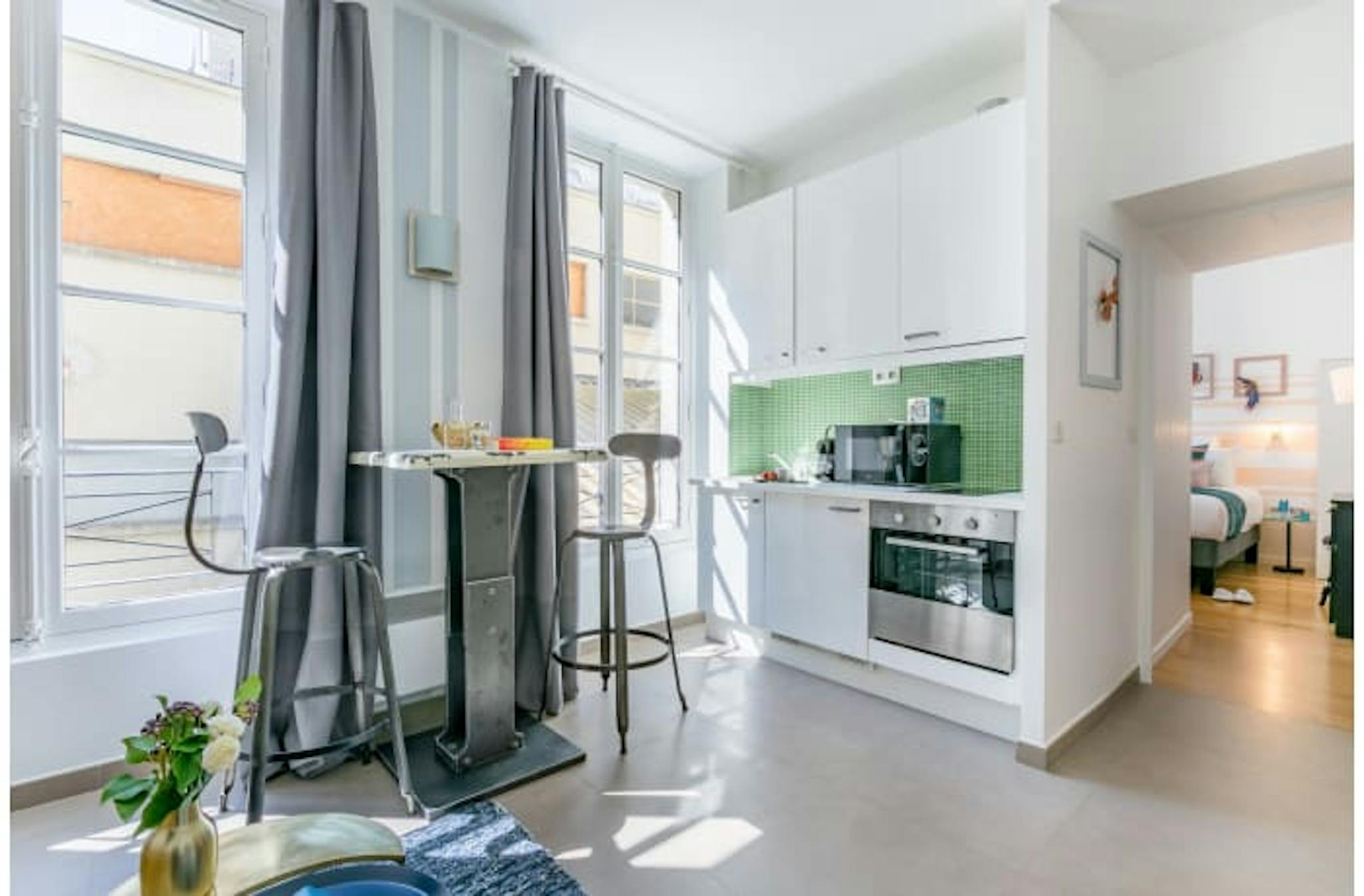 This stylish (hidden) Enghien IX studio apartment is located in the best part of Paris close to great shopping, dining, and many of the most famous attractions. Carefully decorated by our local interior designer to reflect the vibe of the area, you will especially appreciate the attention to detail and elegant furniture. The fully equipped kitchenette is perfect for cooking a meal and the high-quality mattresses ensure you a great night’s sleep.