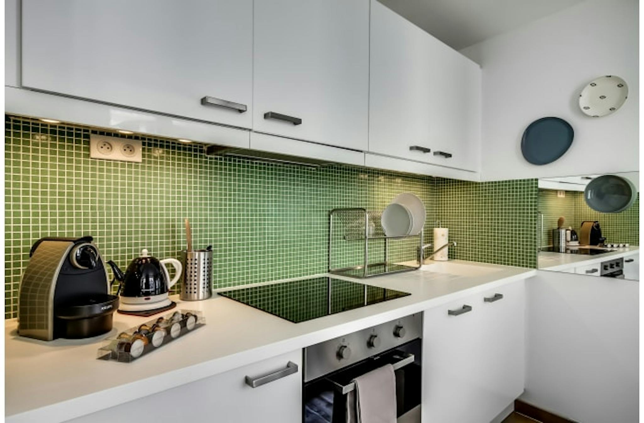 Sleek, modern style meets pastoral charm in this Parisian retreat, refurbished by our local interior designer. Vine-patterned wallpaper, marble accents, and notes of green bring nature indoors, and floor-to-ceiling windows fill the room with light. The fully equipped kitchen has everything you need for in-house dining. Premium amenities include free WiFi, cable TV, hotel beds and linens, luxury toiletries, and a Nespresso machine.