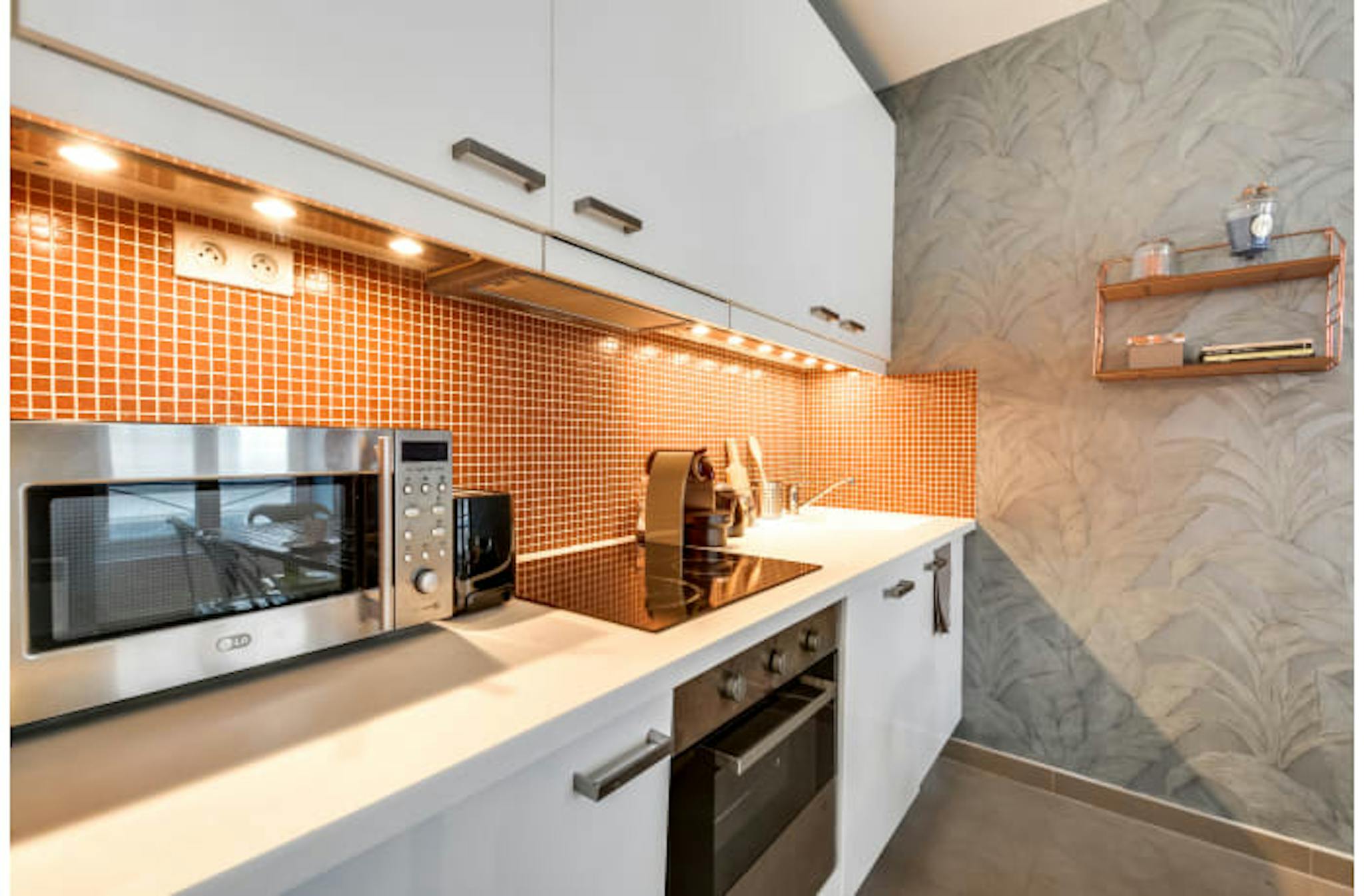 On the ground floor, this vacation apartment has been refurbished by our local interior designer for a light and airy feel. Soothing shades of blue and stately gold accents fill the space with Parisian elegance, while quirky pictures add a touch of humour. A fully equipped kitchen has everything you need for in-house dining. Premium amenities include free WiFi, cable TV, hotel beds and linens, luxury toiletries, and a Nespresso machine.