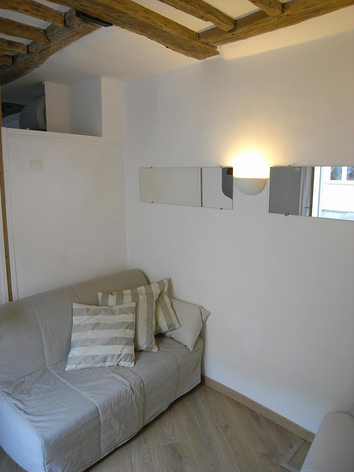 This cosy flat is located at third floor of an ancient characteristic walkup building of the Marais district.