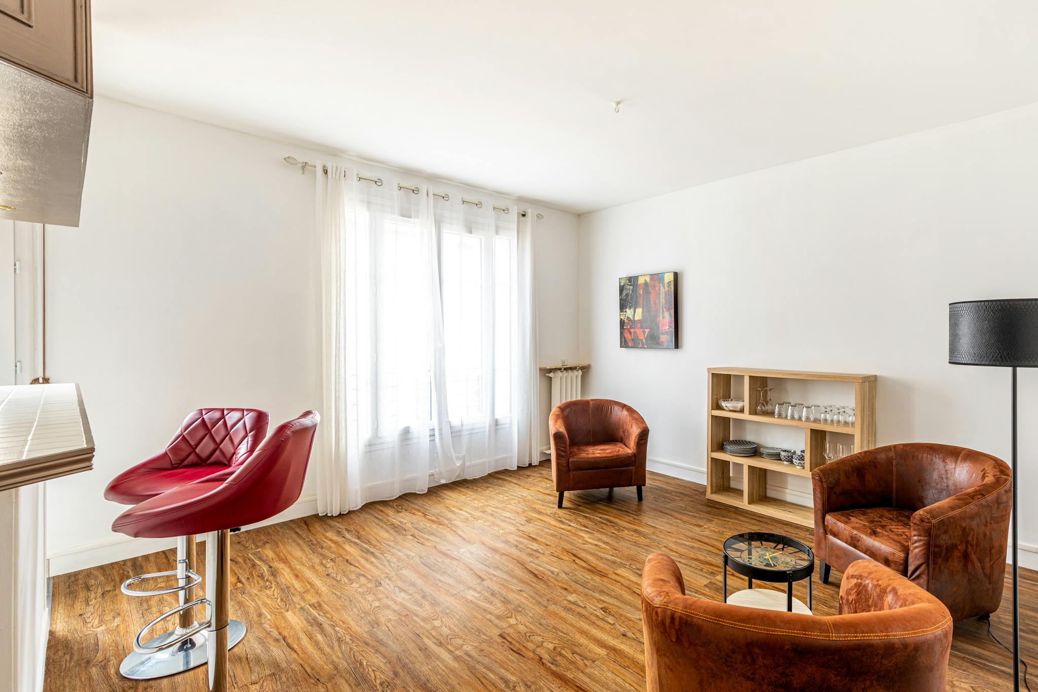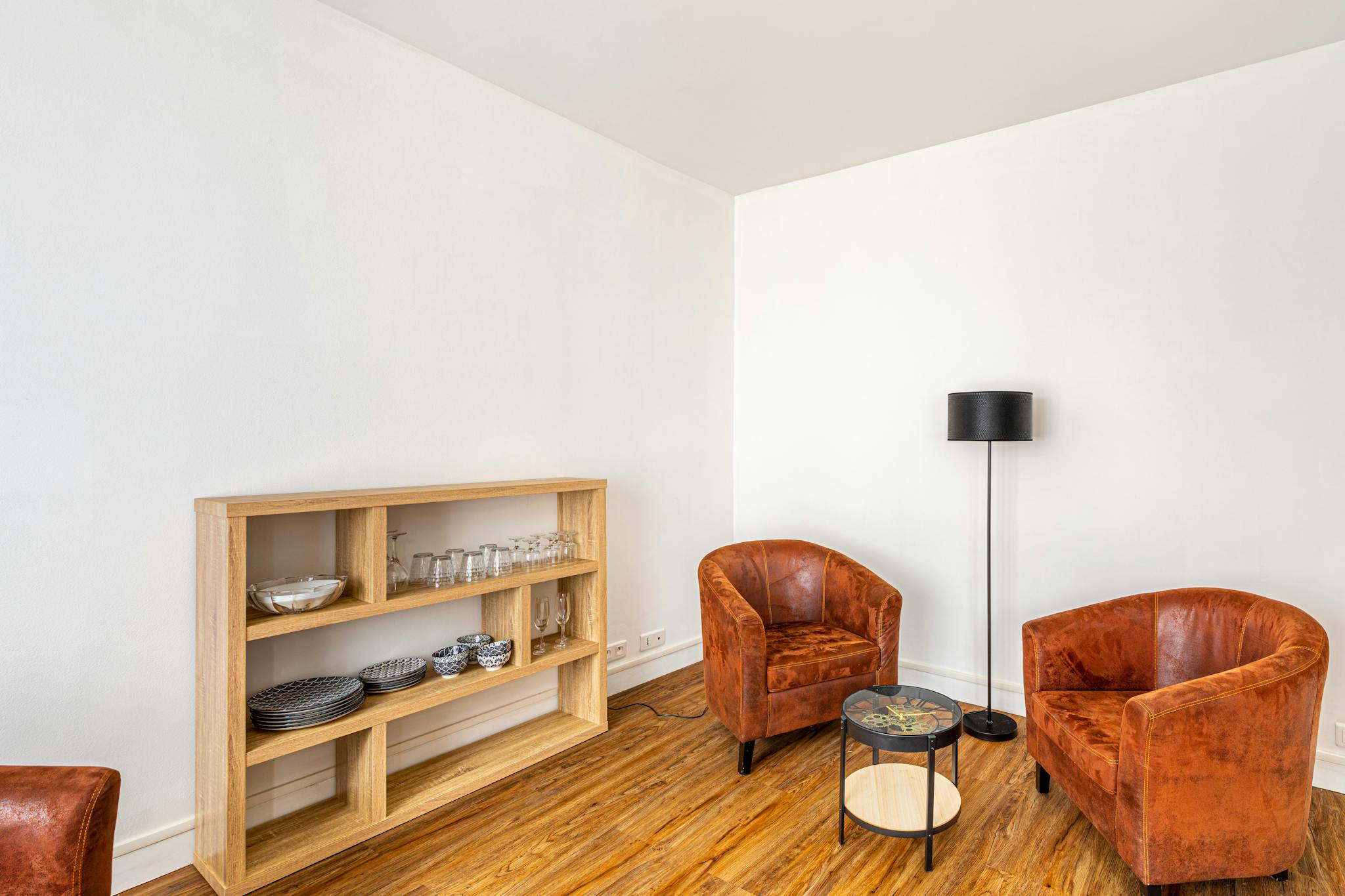 The apartment comes with an open floor plan that is as stylish as it is functional. The living room features 3 armchairs, where you can relax after a long day exploring the city. It's also equipped with a counter and 2 bar stools for you to enjoy your meals.
