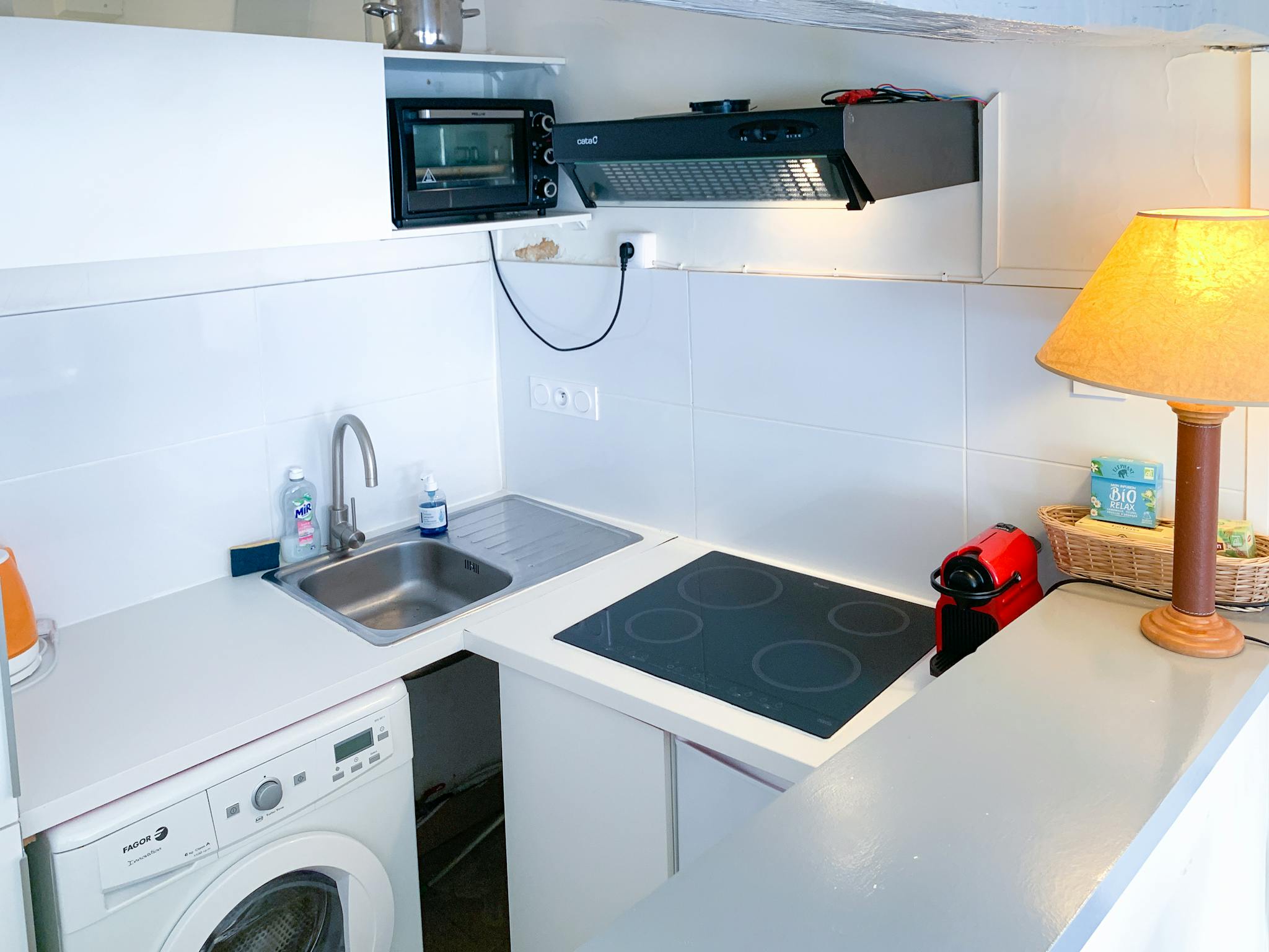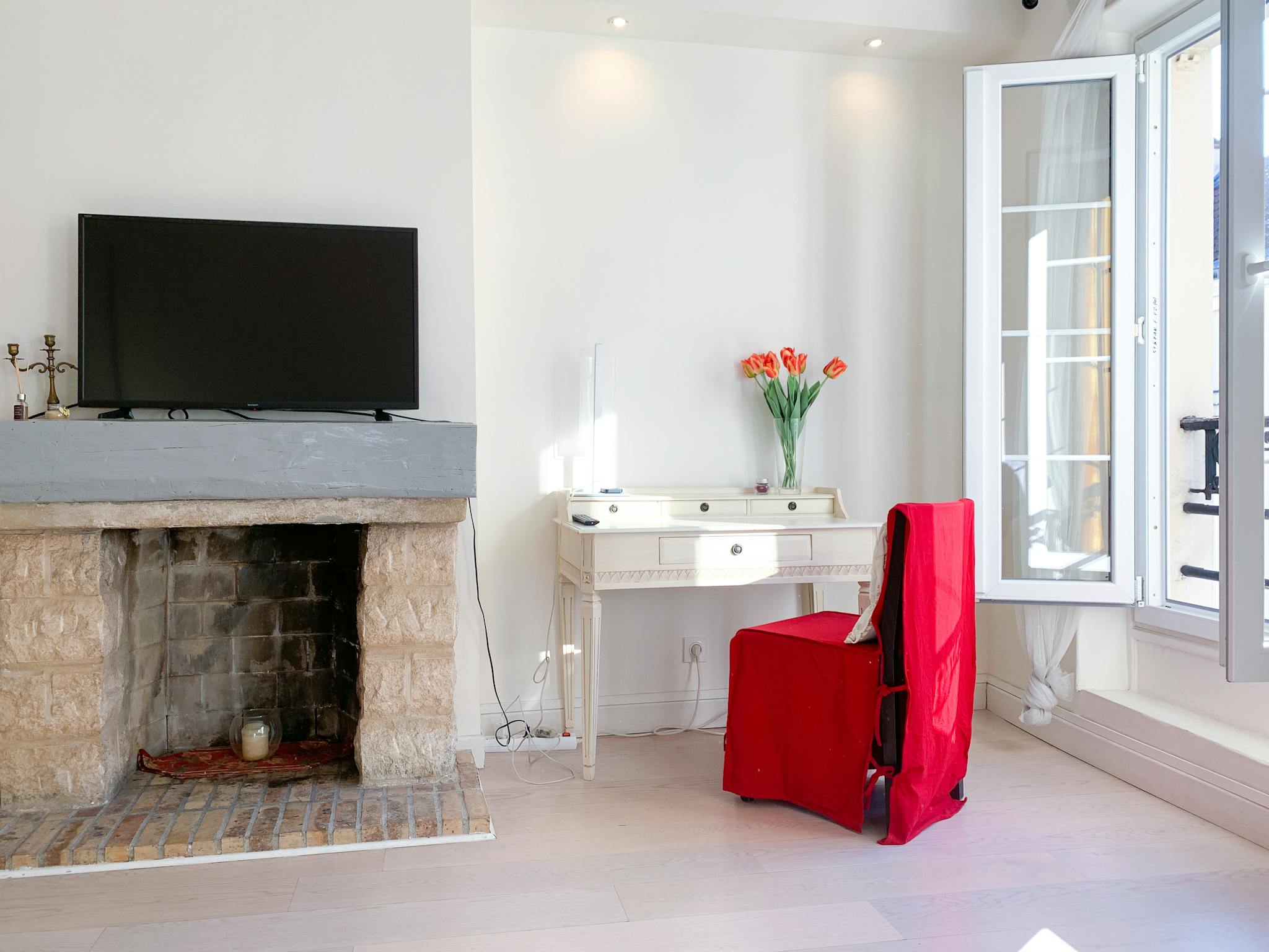 Located on the 3rd floor, it overlooks the street and the roof / sky section of the building opposite, and takes advantage of its west orientation to be bathed in the afternoon sun through its 2 beautiful windows. Its charm is accentuated by a fireplace that sits in the middle of the living room, in front of which opens a convertible sofa offering 2 beds. It benefits from an office, storage space, and is open to an American kitchen with its bar, equipped with everything you need to prepare or heat up small dishes. The bathroom has a fairly good size shower, sink and toilet. He finally has a washing machine.
