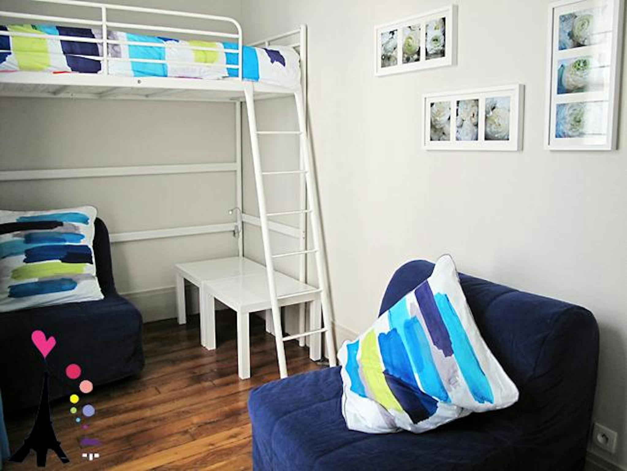 This apartment can accommodate 5 people. It was completely renovated in August 2011 and it is located on the first floor. Side living room, a view of a quiet street, side rooms, a view of the courtyard of the building quiet. The apartment consists of an entrance serving the living room with open kitchen, fully equipped. There is also a table for dining, a double sofa bed, TV, stereo and internet. On the other side of the hallway you access the bathroom with bathtub, sink and toilet. The hallway also provides access to two bedrooms (which are communicating): master bedroom with double bed, small desk and a large closet, and the second bedroom is ideal for children with a raised bed and 2 armchairs - beds extra. There is also a dresser for storage.