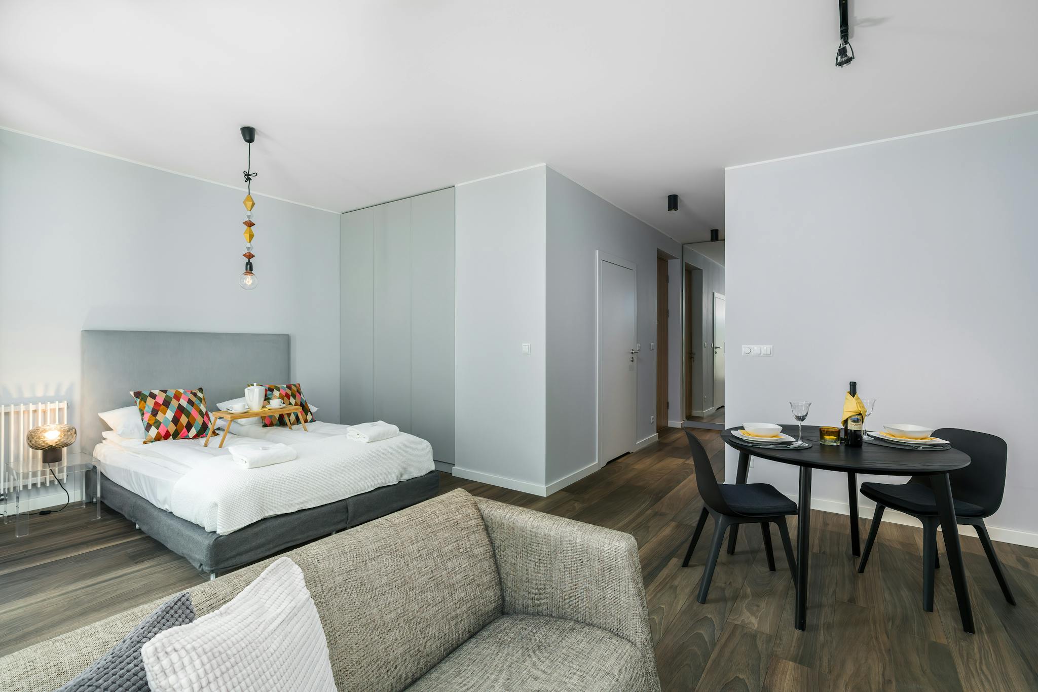This beautiful studio apartment with large windows and a terrace will be perfect for a couple! If you are looking for a cozy place to spend time together - just the two of you - this accommodation will be the right choice! The apartment has a fully equipped kitchenette with an induction hob, oven, dishwasher, coffee machine, fridge and all necessary kitchen utensils. Guests have at their disposal a beautifully decorated living room with a flat-screen TV, a sofa and a comfortable double bed. The bathroom is equipped with a shower and a washing machine, and there are also towels for each guest. There is garden furniture on the terrace - a table with two chairs. Guests can take full advantage of fast Wi-Fi Internet and amenities such as a vacuum cleaner, iron and hair dryer.