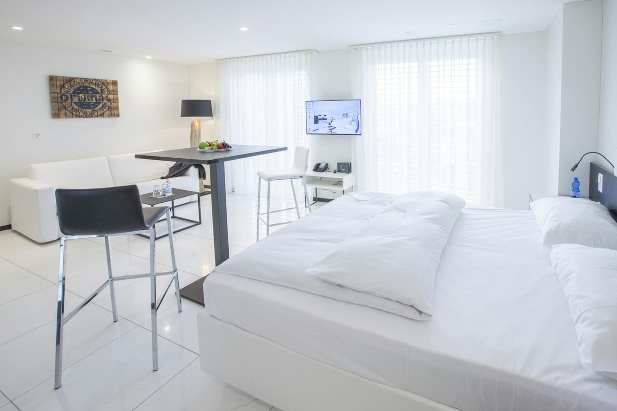 Self-catering guests can rent larger suites and flats with a kitchen, with cooking facilities and refrigerators integrated harmoniously into the rooms as modules.