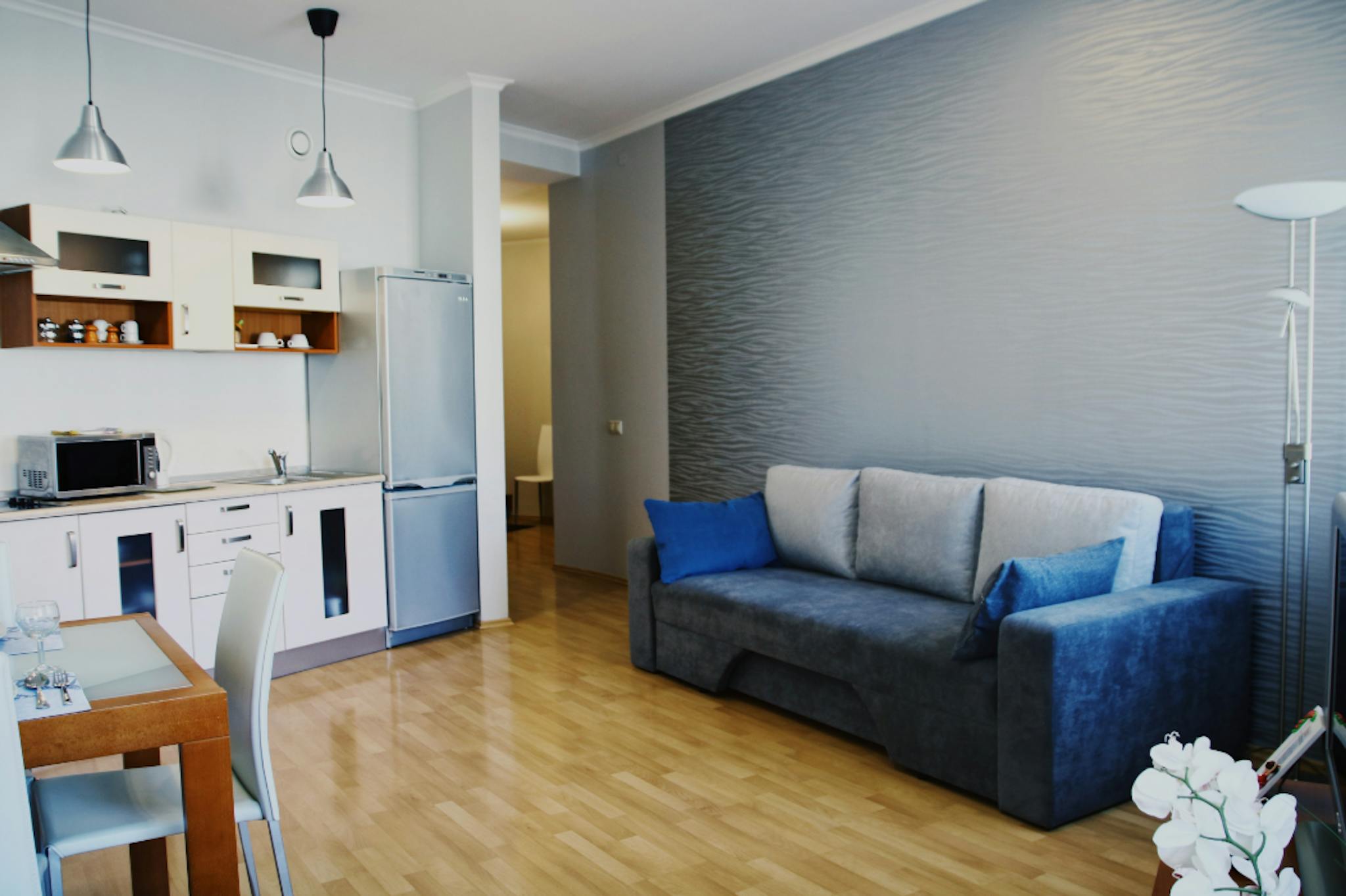There is a comfortable double bed in the sleeping area of the apartment. Spacious living room with dining table and a sofa for 2 persons.
