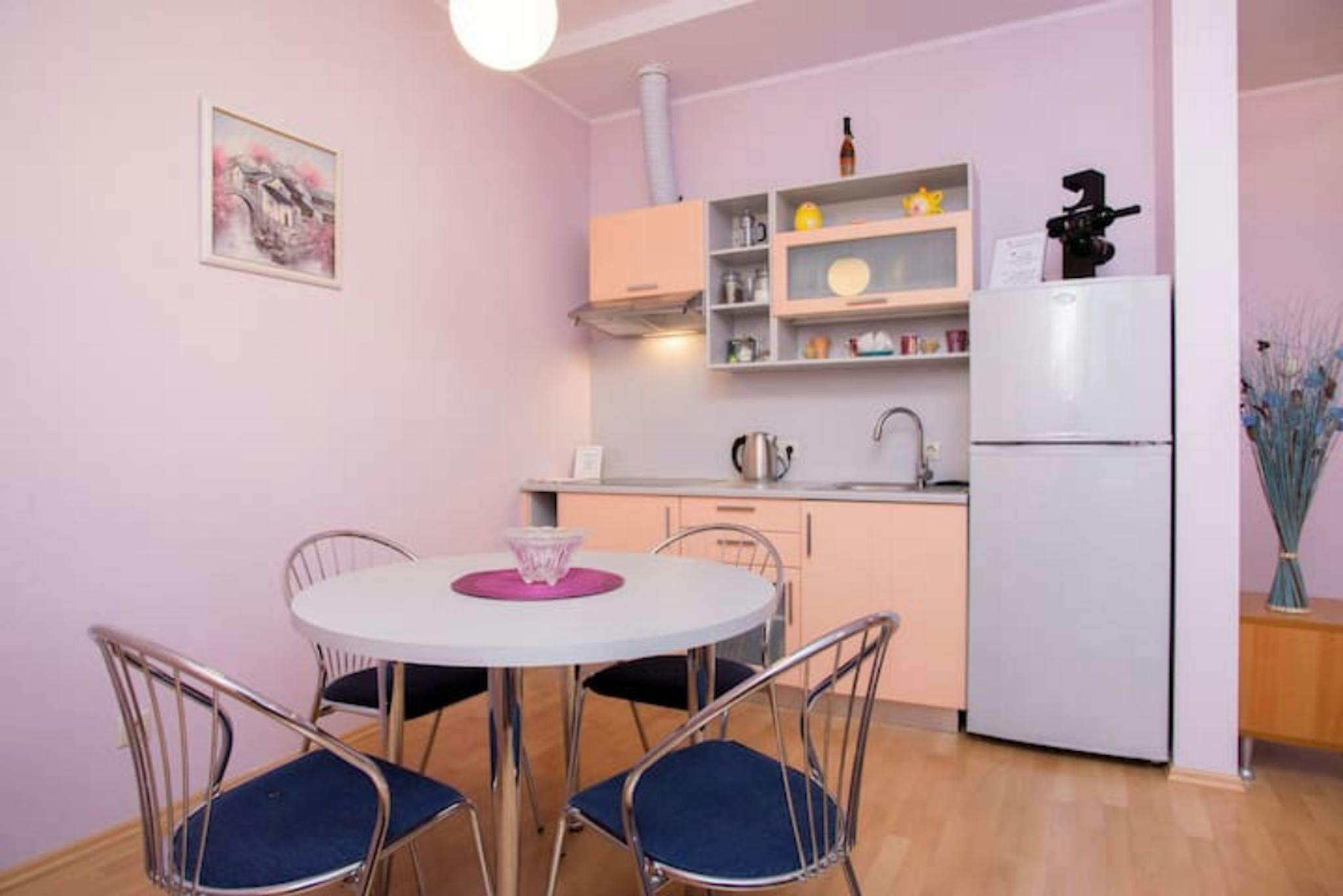 The sleeping area of the apartment has a comfortable double bed. Spacious living room with dining table and sofa. Kitchen is equipped with electric hob, microwave, toaster, kettle, refrigerator, pots, pans, plates.