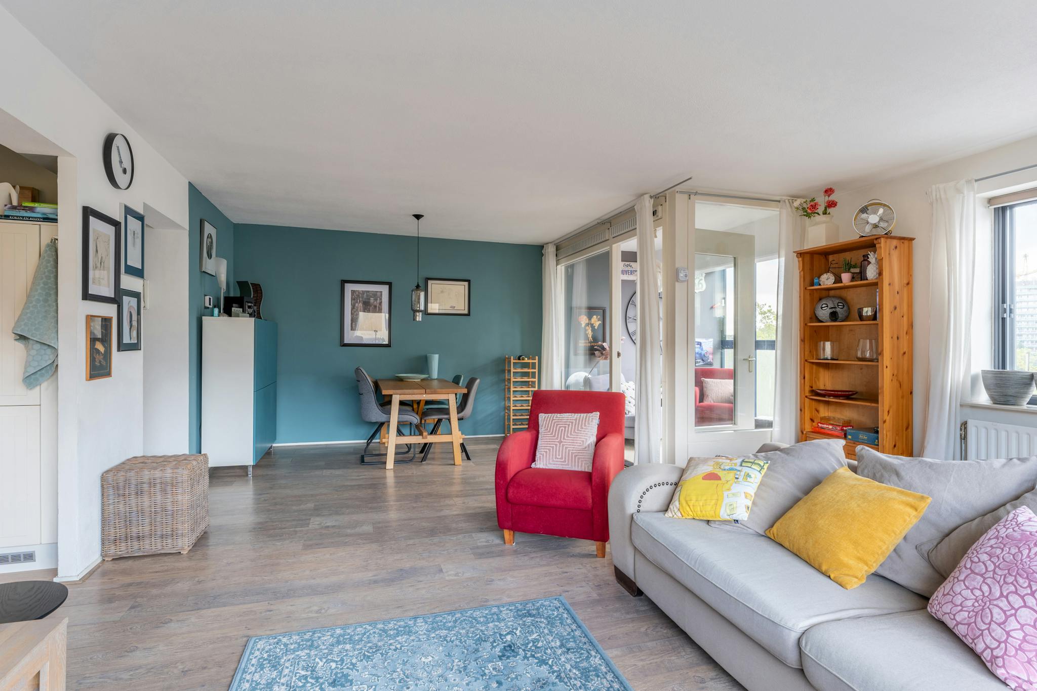 The completely furnished 96 m2 apartment is on the 3rd floor of a large apartment building. The corridor of the apartment is equipped with the meter cupboard and provides access to the bathroom, a separate toilet, two bedrooms, the laundry room / storage and the living room. The apartment building has fully transferred to district heating (stadswarmte in Dutch) recently, a sustainable and cheaper alternative to traditional fossil fuel heating.