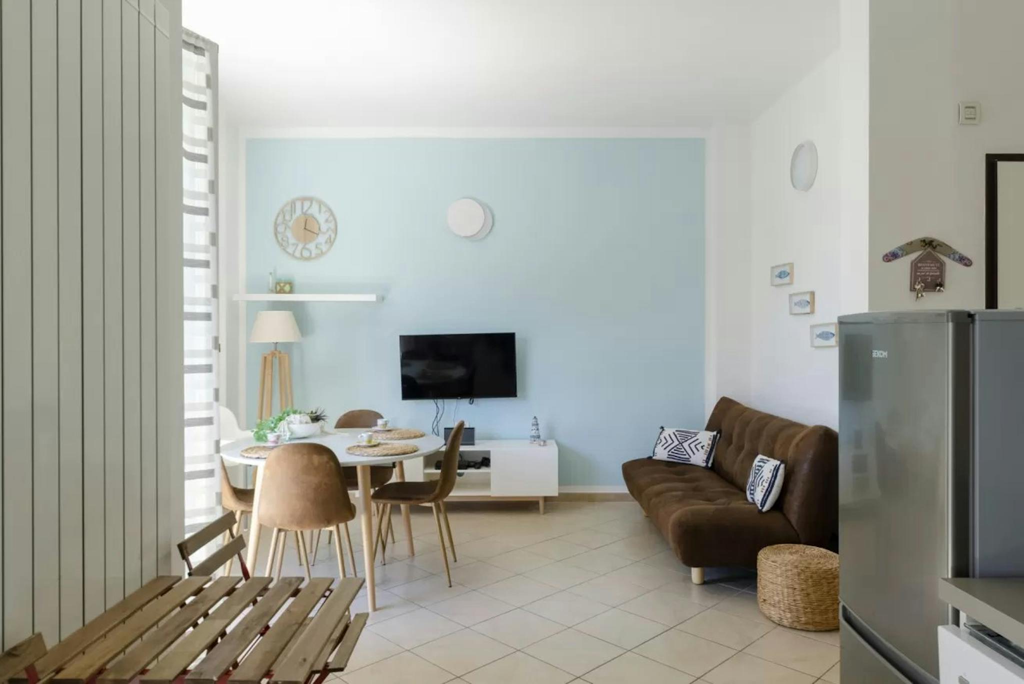 The modern kitchen is equipped with all the necessary amenities, including a coffee machine, refrigerator, stove, oven, microwave, and dishwasher. A convenient dining area provides space for quick snacks. The living room offers a comfortable sofa, a flat-screen TV, an elegant dining area that accommodates up to 4 guests, and a high chair for a baby. Glass doors in both the living room and kitchen open onto the terrace.