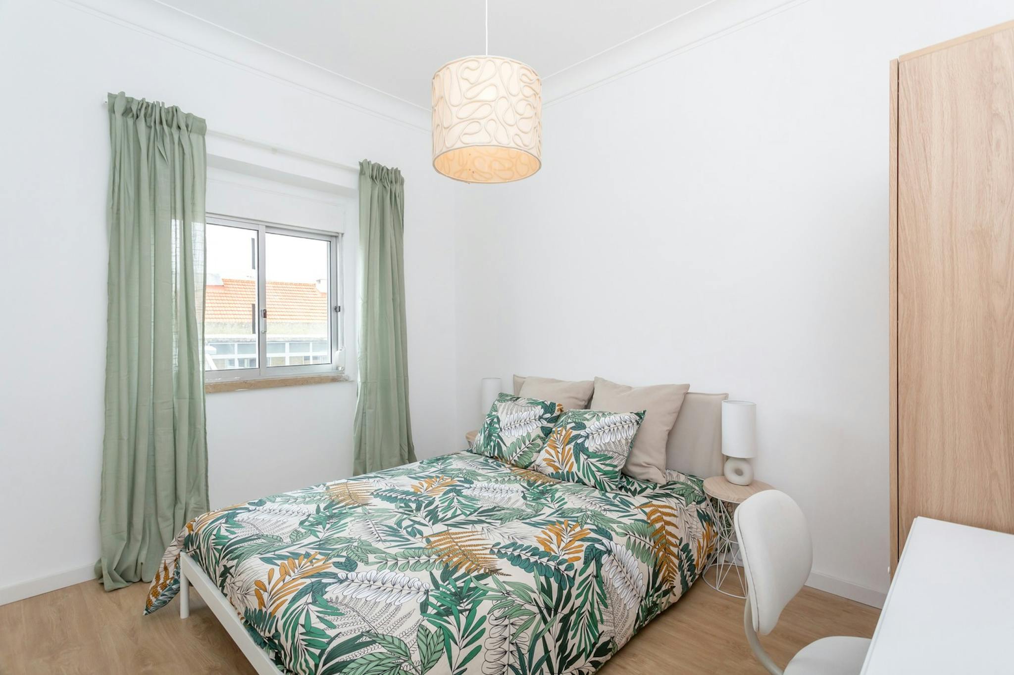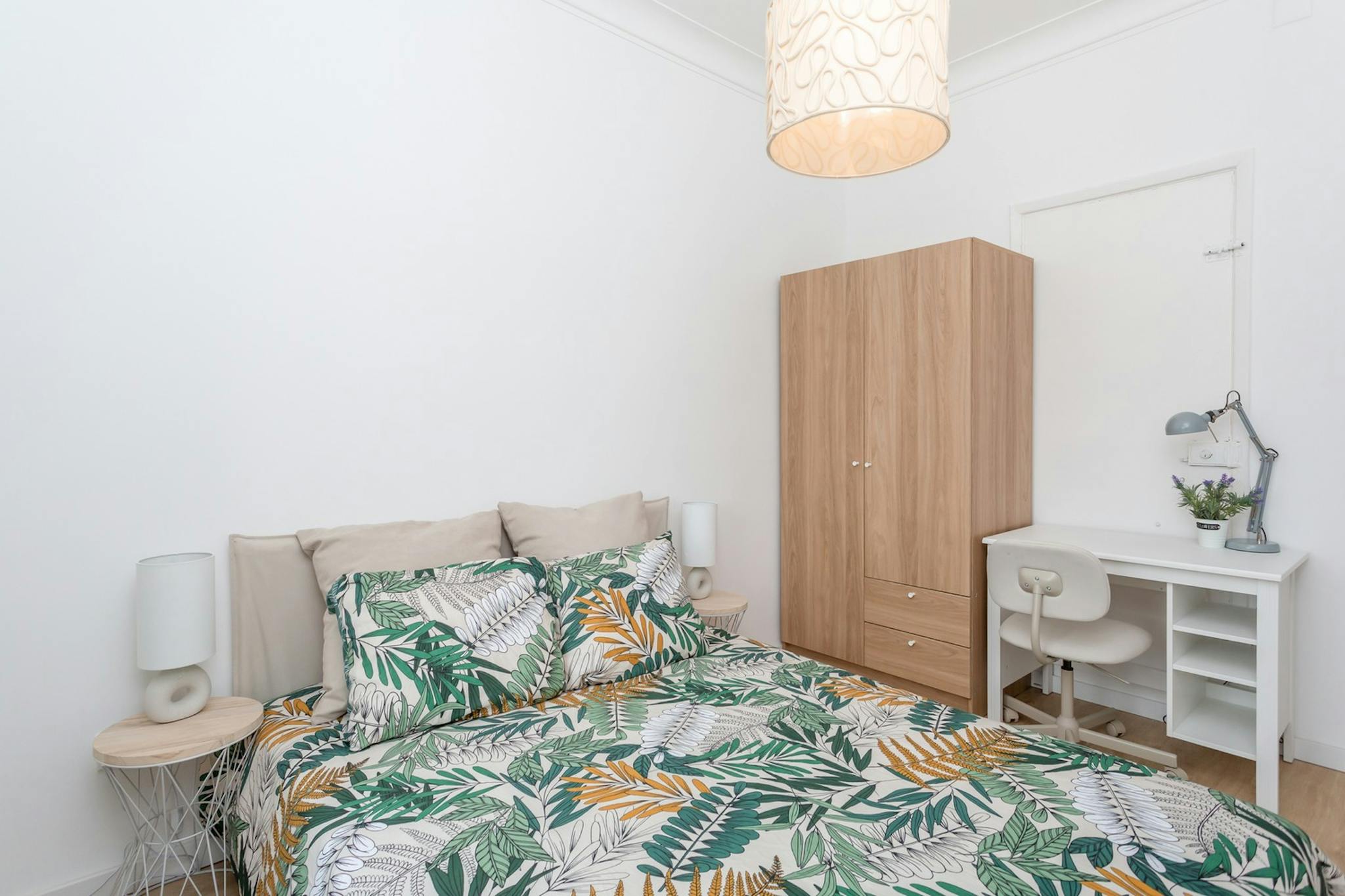 The modern and comfortable room has a quality bed and mattress, desk and storage. The room has lots of natural light.