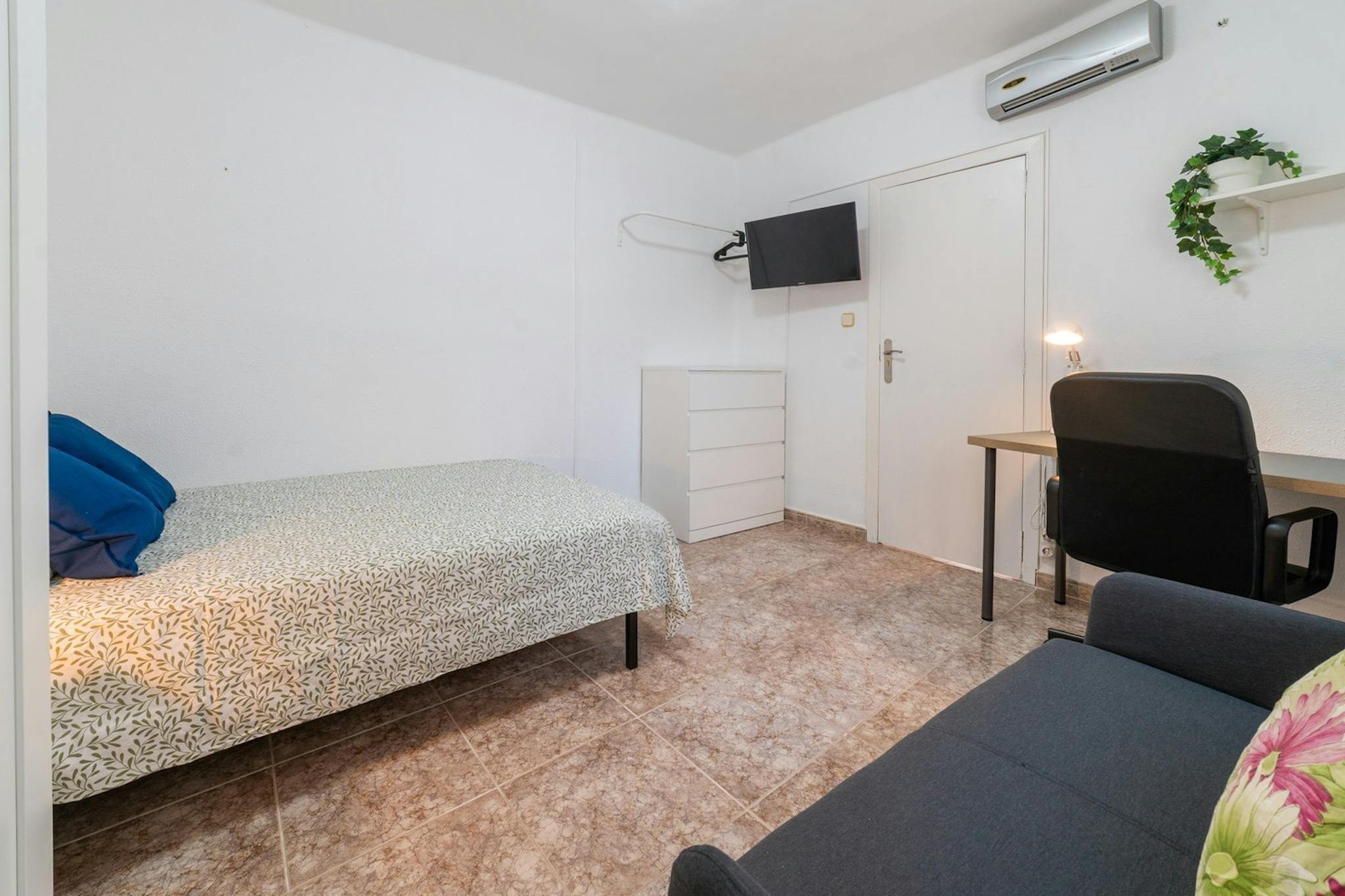 Luminosa habitación en Torrente. Dispone de todas las comodidades que puedas necesitar, cama individual, TV, armario, mesa de estudio, silla cómoda para trabajar largas horas.