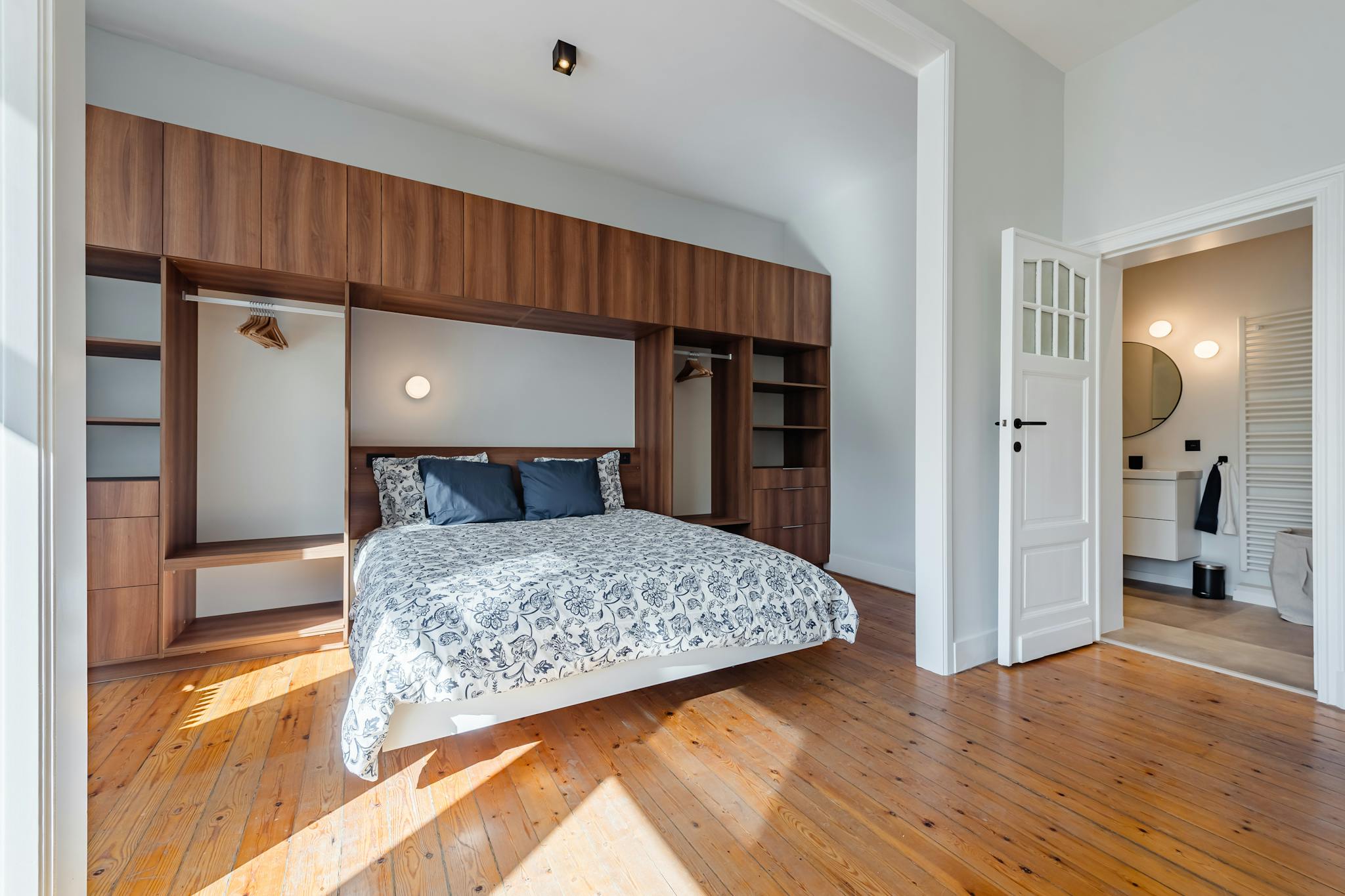 39m2 room with a double bed, a small desk, a clothes cupboard, a shower, an individual toilet and a balcony. In addition to this beautiful private space, you will enjoy a magnificent common space to share in coliving with the other occupants of the house. The common area and the stairs are cleaned weekly by our team. 1.150€ + 150€ charges ( charges include gas, electricity, water, internet, TV and cleaning of communal areas )
