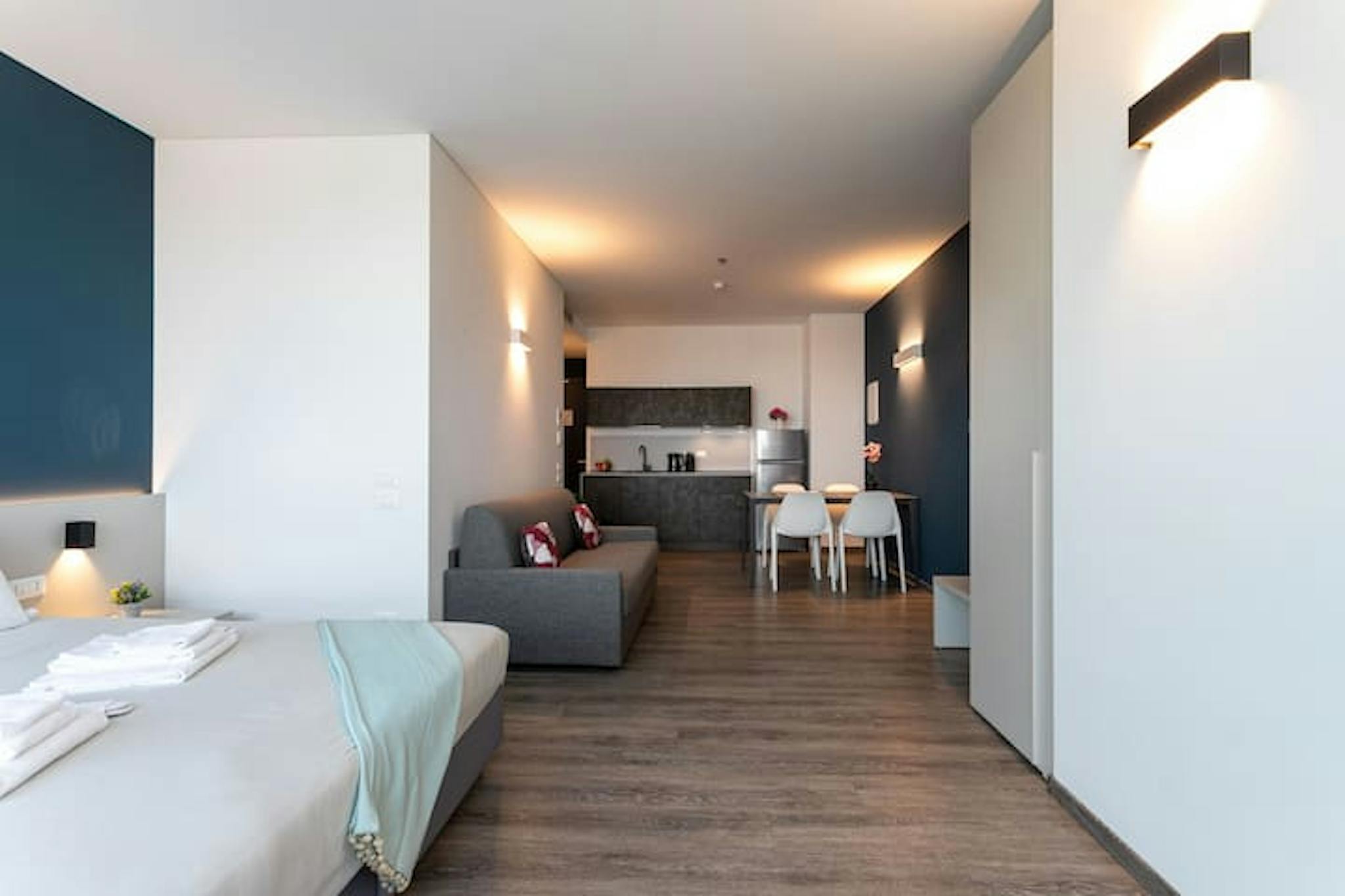 The living space boasts a standard sofa bed, while the kitchen is fully equipped with dishes, a dishwasher, an induction hob, a coffee machine, and a washer-dryer. Additional amenities include a smart TV and a spacious wardrobe with a built-in safe.