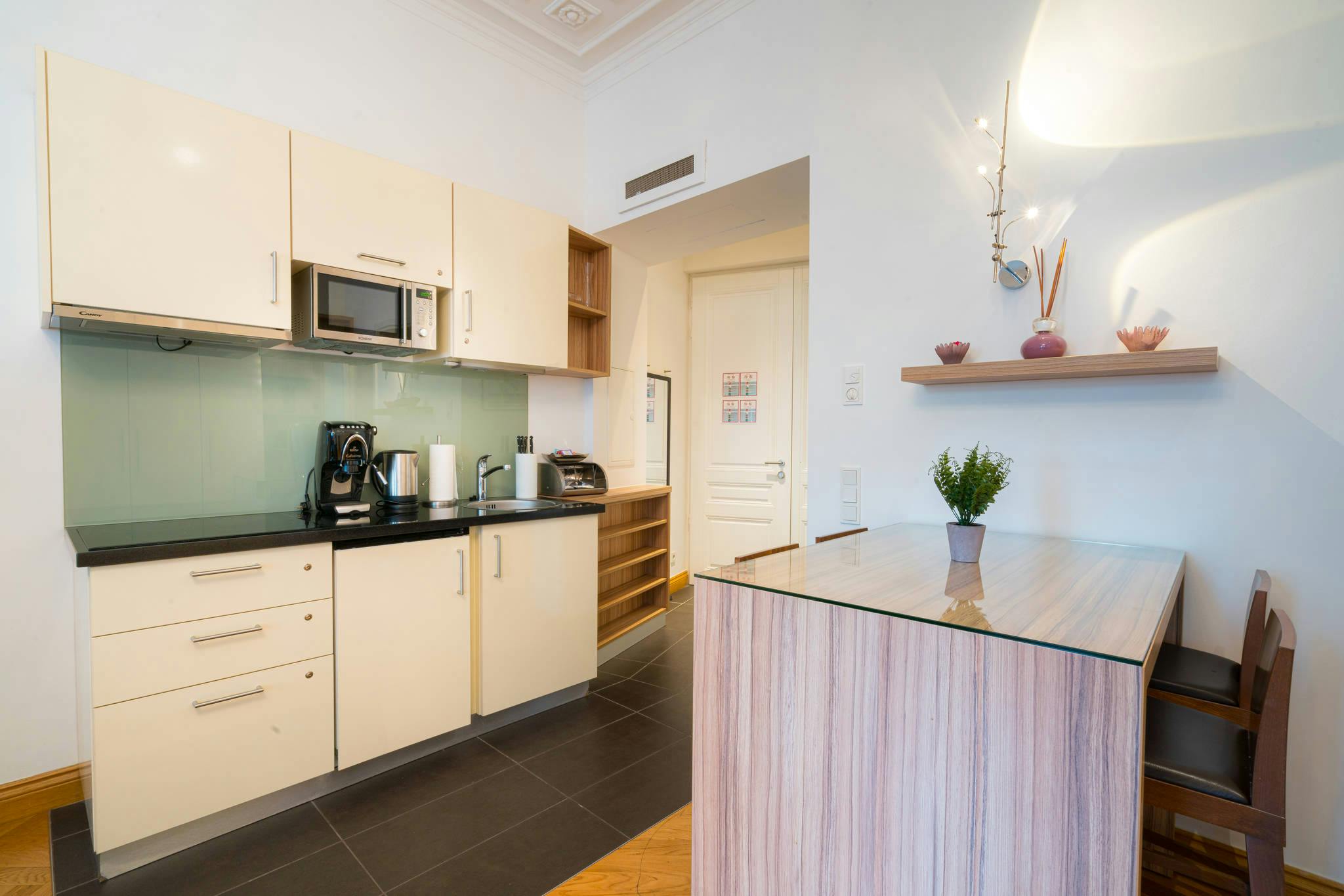 All 13 premium apartments have beautiful high ceilings typical of Vienna’s old buildings, a smart online key system, fully air-conditioned rooms, and practical work areas. Whether you’re looking for a cozy business apartment, something more spacious with a private balcony, or an extravagant accommodation – you will find your ideal temporary home here. The penthouses, for instance, have a large roof terrace and huge windows. From there, you have an impressive view over Vienna and you can overlook the Vienna City Hall or the Votivkirche.