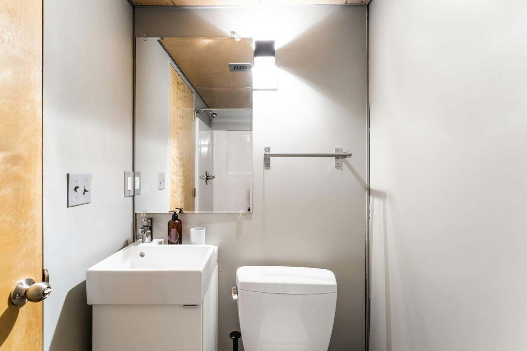 This innovative Brookland home, made entirely of repurposed shipping containers, does not skimp on comfort. Each of the 6 bedrooms has its own bathroom, while a large central living room, dining room and kitchen area to bring the entire home together. The space features chic furniture decor such as aesthetic light fixtures, floor plants, accent rugs and wood furniture. The living room features a TV for all your home entertainment needs, while the adjacent kitchen has a long metal island-style table with stools for sitting. It doubles as a breakfast spot and master meal prep station.