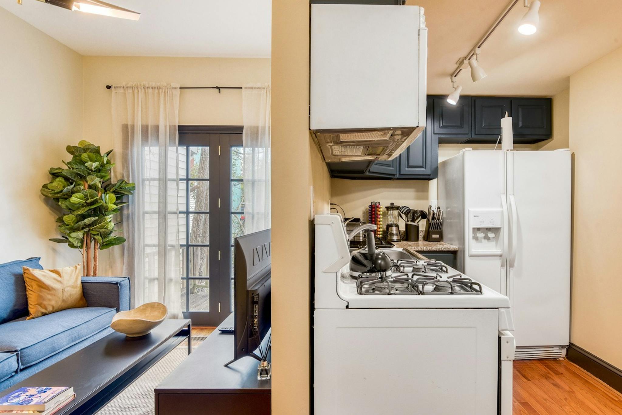 Down the foyer hallway you’ll find a quaint newly renovated kitchen with cabinets painted in a muted blue tone which seemingly coordinates with the sofa in the adjacent room. Two three legged mid-century chairs tucked under a perfectly sized walnut bistro table sits directly outside of the kitchen area and shares space with the living room. The home features five bedrooms and two full bathrooms, which all have been meticulously designed to be both highly aesthetically pleasing but also functional. The off-white walls mixed with the contrasted black moldings with gold and navy blue decor are carried throughout creating a cohesive mileu. A ten-minute walk from the front door of the building will get you to the train station at the corner of 14th Nowthwest Street and Irving Northwest Street for the M train on the Columbia Heights Line. This apartment is a smoke-free unit that includes paid WiFi.