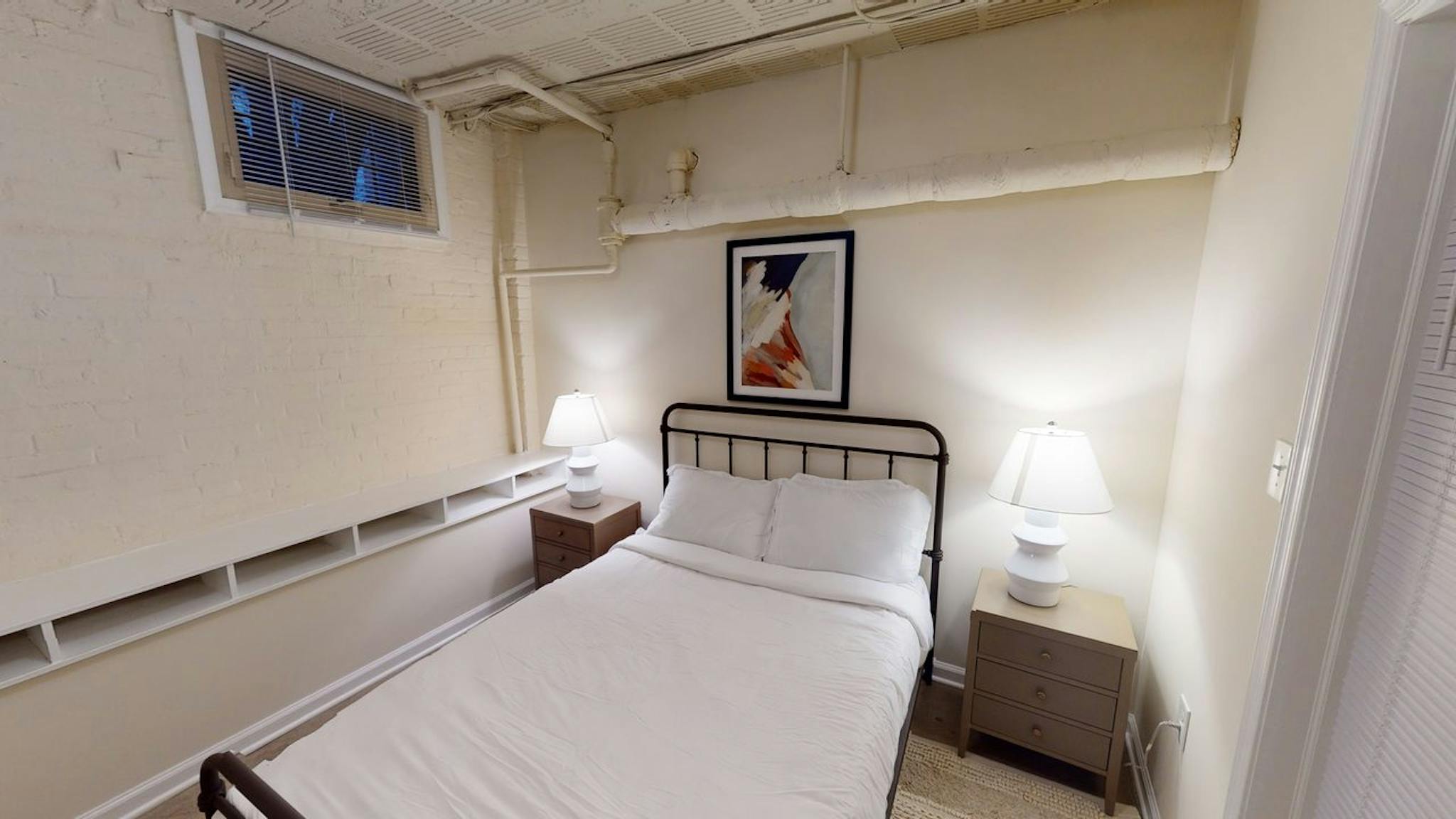 Book a tour today to see this spacious shared apartment in Washington, D.C. Located in (hidden)ment of a four-story brick building on a tree-lined residential street in Dupont Circle, this five-bedroom, two-bathroom unit is now on the market at an unbeatable price for this highly sought-after area. At 1565-square-feet, this newly renovated apartment features central heating and air conditioning, exposed brick interior walls, freshly painted baseboards and walls, a gourmet kitchen with new appliances, modern lighting fixtures, and polished concrete floors. A perfect place to live close to Downtown, this unit includes WiFi, a wall-mounted flat-screen TV, and access to laundry facilities located inside the building. This apartment is steps away from bars, restaurants, and supermarkets on Connecticut Avenue, the main commercial corridor into Dupont Circle. A seven-minute walk will get you to Dupont Circle Metro Station for the Red Line train of the Washington Metro. With readily available street parking, this apartment is an ideal home for working professionals that commute by car. Proximity to several nearby educational institutions like Georgetown University should appeal to college students wanting to live close enough to campus to ride a bicycle or walk. If you want more space for yourself or plan to move in with friends, ask about renting this entire apartment. This unit comes unfurnished but can be fully furnished for an additional fee and stays longer than three months. Bedrooms in this cozy yet spacious Dupont Circle apartment easily accommodate full-size beds and nightstands. All five bedrooms offer closets for storage and at least one window for some much-needed natural light during the day. You have the option of having your room furnished or unfurnished. Bathrooms have been recently remodeled and feature bathtub and shower combinations, built-in shelving, chrome fixtures, large mirrors that match the stained wood vanities, new sinks, and tiled shower walls. This unit boasts an open-concept design, making the living room and the combined kitchen and dining room feel larger. The front door of this beautiful basement apartment opens to the combined gourmet kitchen and dining room which is plenty big and can easily support a four-person dining table and chairs where a contemporary chandelier hangs. The kitchen comes equipped with new stainless steel appliances, including a dishwasher, and features custom wood cabinets and large granite countertops. The kitchen includes a breakfast bar that seats three, a convenient place for a quick meal or entertaining guests while preparing food. The living room features a large built-in shelf and cabinets, the perfect spot for a large flat-screen TV and all of your media components. Small but cozy, this living room can accommodate an armchair, a medium-size sofa, and a coffee table. A chandelier that matches this apartment’s modern motif hangs brightly over the living room, giving you plenty of light when needed.